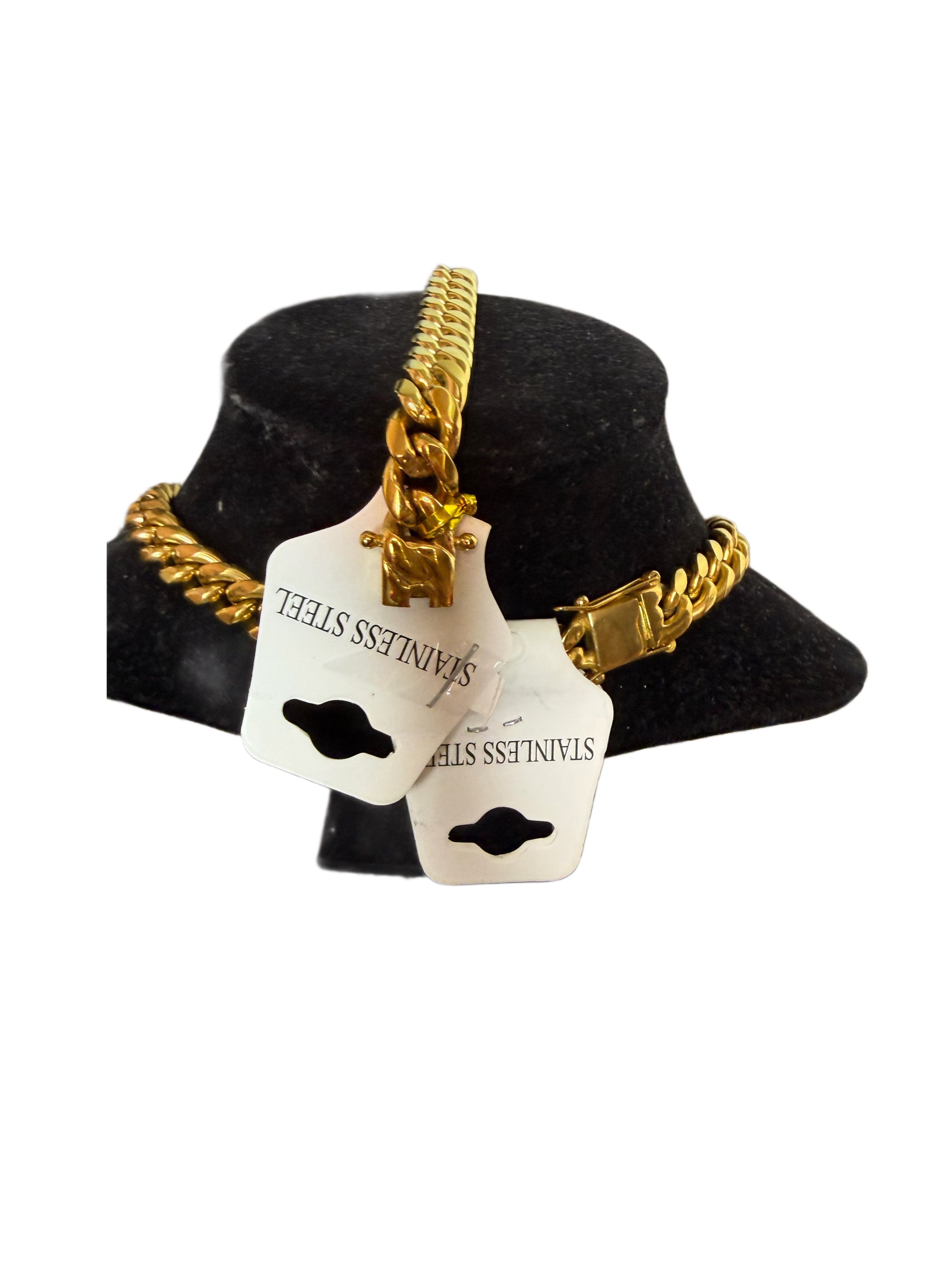 Chunky necklace set and braceletThe K1000 set features a chunky high-fashion design crafted from durable stainless steel. This material is resistant to corrosion, enhancing the longevity of the product. Its bold aesthetic complements modern styles, making it suitable for a variety of fashion settings.